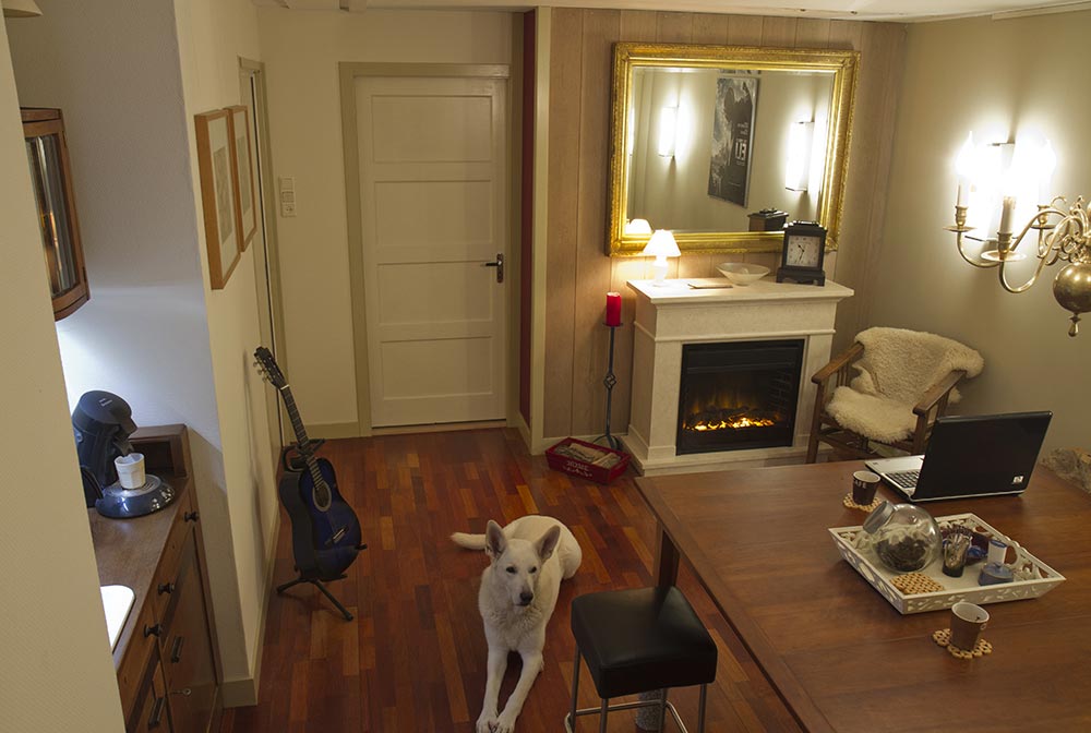 De studio bevindt zich in een ruime kelder, gedeeltelijk onder het woonhuis, grotendeels onder het terras, waarin beloopbaar glas zorgt voor daglicht in de ruimte. Mede hierdoor is het aangenaam toeven in de studio. Voor onze gasten is er een sfeervolle ruimte met “open haard”. Schuif aan aan onze stamtafel en geniet van een vers gezet kopje koffie.